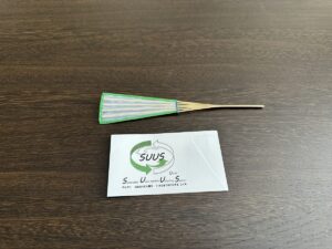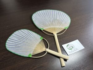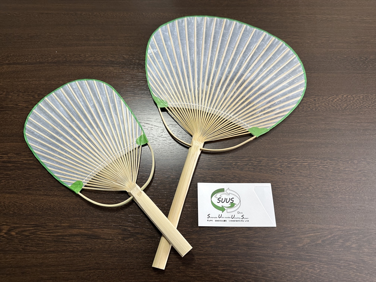 このうちわ・しおりは、社会福祉法人うぶすな会が、この仕組みによりうどん麺から作ったSUUS紙(=微生物紙)を用いて、丸亀うちわ職人の方に製作を依頼したものです。